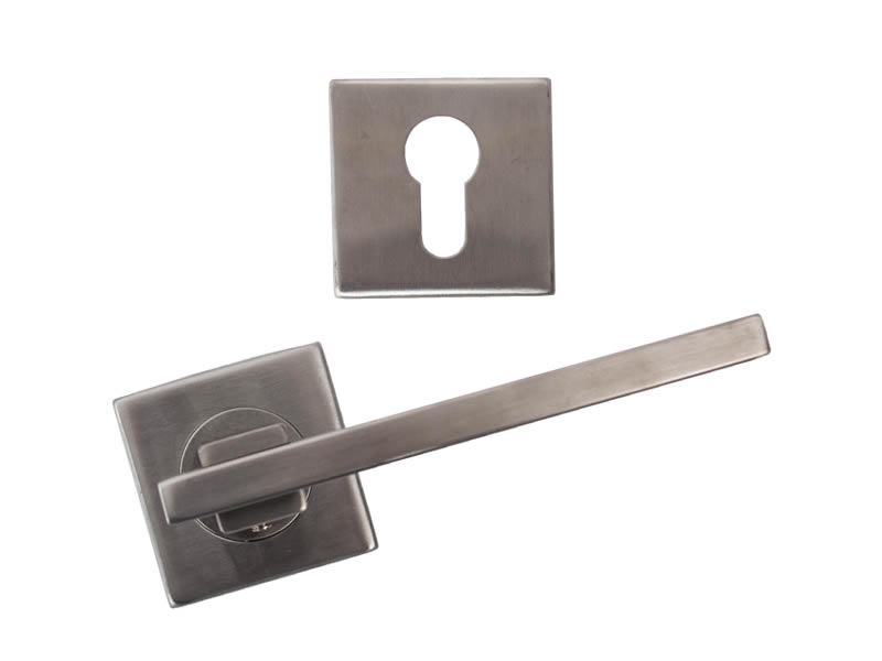 Acero Inoxidable Satinado 304. Manillas con muelle de recuperación, cuadrante de 8mm y tornillos pasantes. Incluye bocallaves. Acabado: Acero Inoxidable.