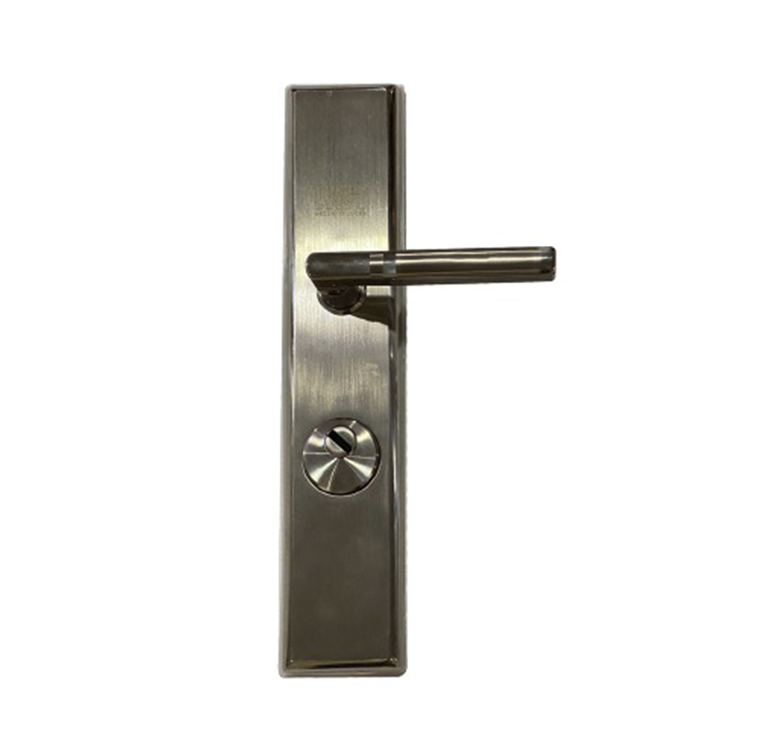 MANILLAS CON PLACA LARGA Y ESCUDO: Placa con Bocallave para cerradura con cilindro perfil europeo, Manillas con muelle de recuperación y cuadradillo de 8mm. La medida es de 6.5 cm de ancho por 33 cm de alto y 1 cm de profundo. Acabado: acero inoxidable